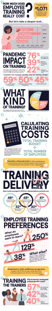 According to Training Magazine’s 2021 Training Industry Report, the average company in the U.S. spent $1,071 per employee this year on training costs; that’s $40 less per person compared to 2020.