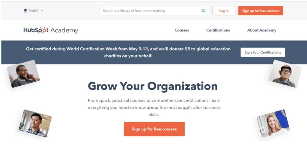 HubSpot offers beginning, intermediate, and advanced quick courses, bite-sized lessons, and comprehensive certification programs. Topics fall within the areas of inbound marketing, sales, or customer service. For instance, professionals worldwide go to HubSpot Academy to learn about social media marketing, email marketing, content marketing, and inbound sales. Training is online and free.